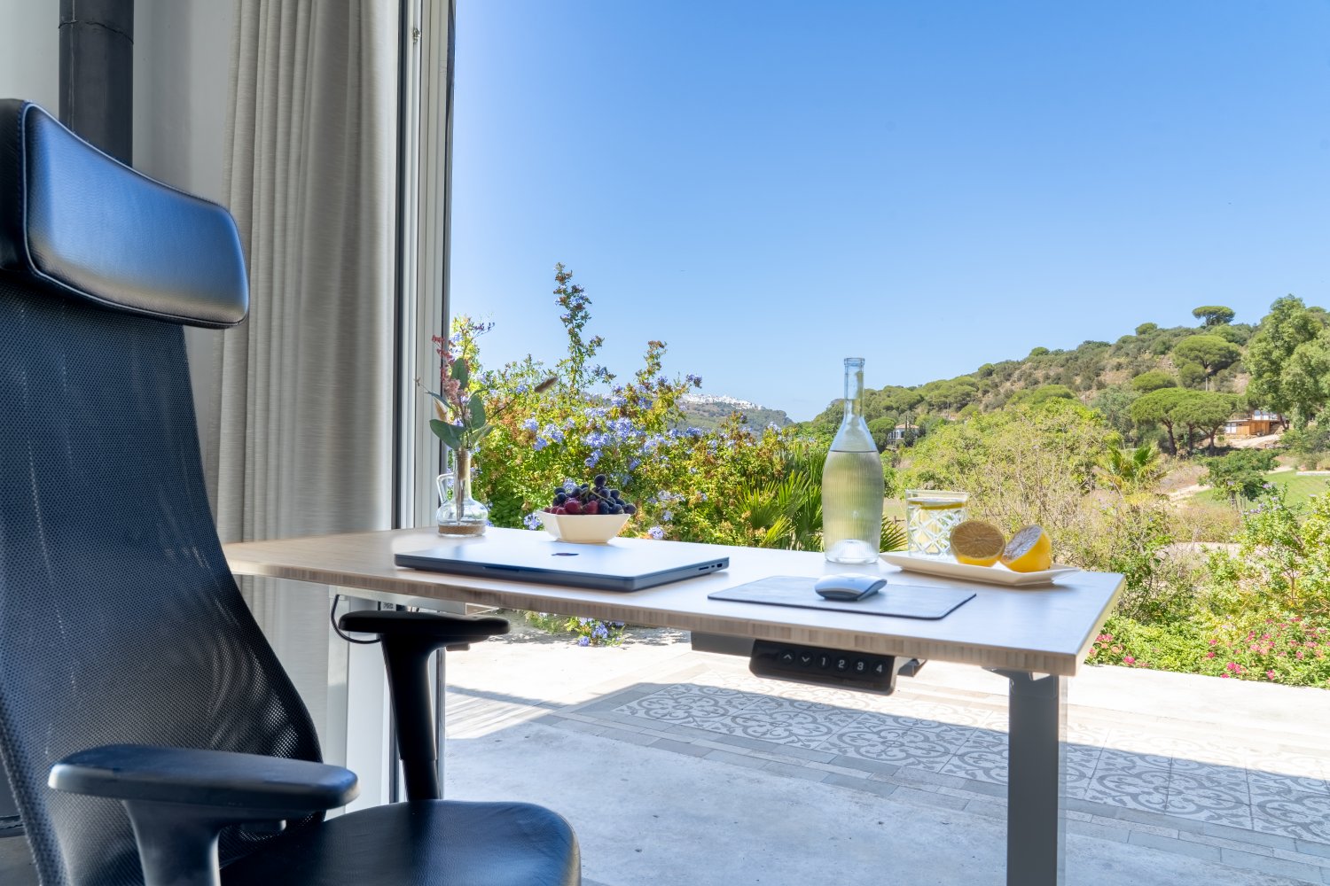 - im Wohnzimmer: höhenverstellbarer Schreibtisch (120x60 cm) mit Bürostuhl. Sehr schöner Blick auf die grüne Umgebung. Bitte beachten, dass die Sitzmöbel dafür etwas verschoben werden müssen. Buchbar als „Workspace Premium“. Buchbar als „Workspace Basic“ (Standard-Schreibtisch) oder „Workspace Premium“ (höhenverstellbarer Schreibtisch).