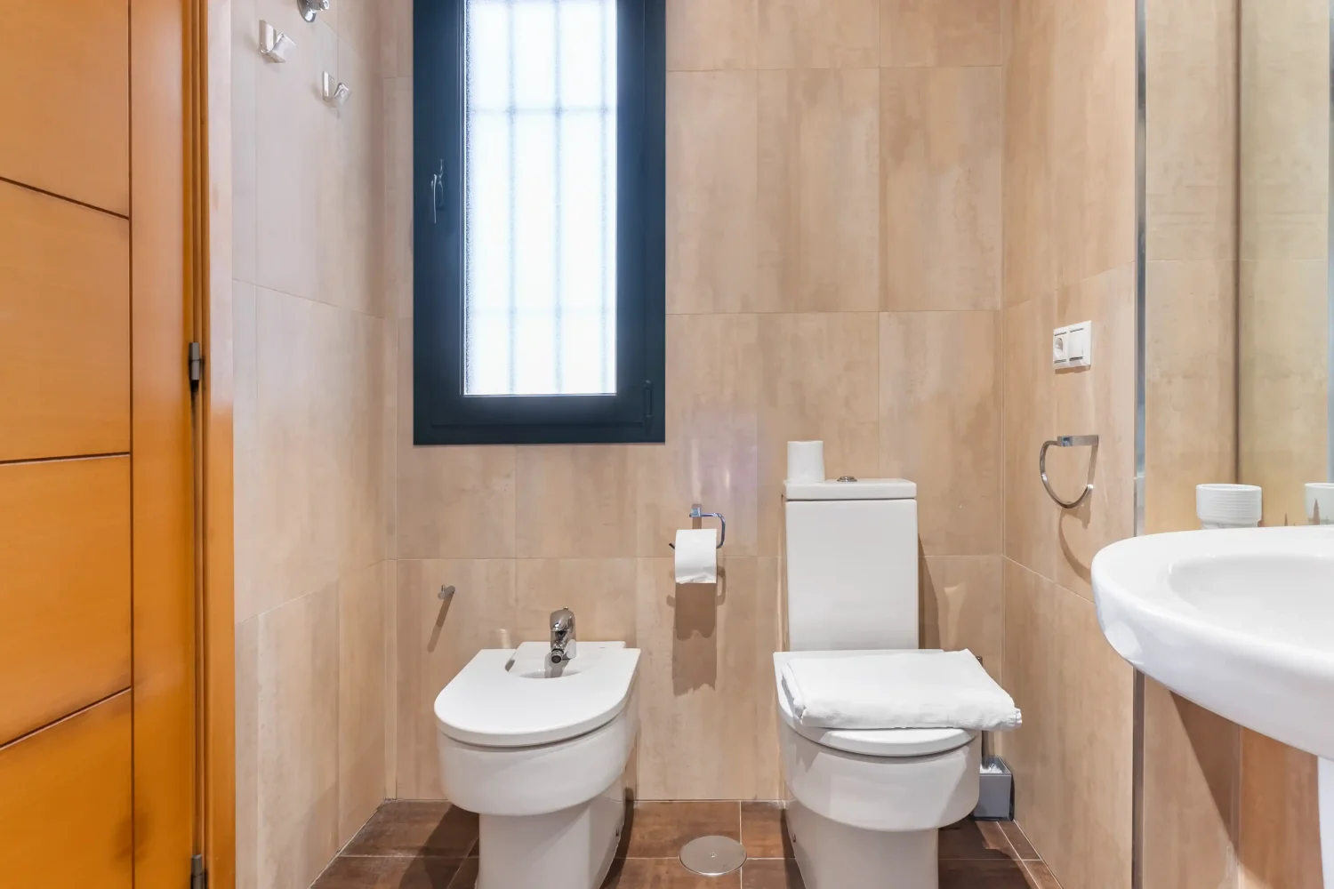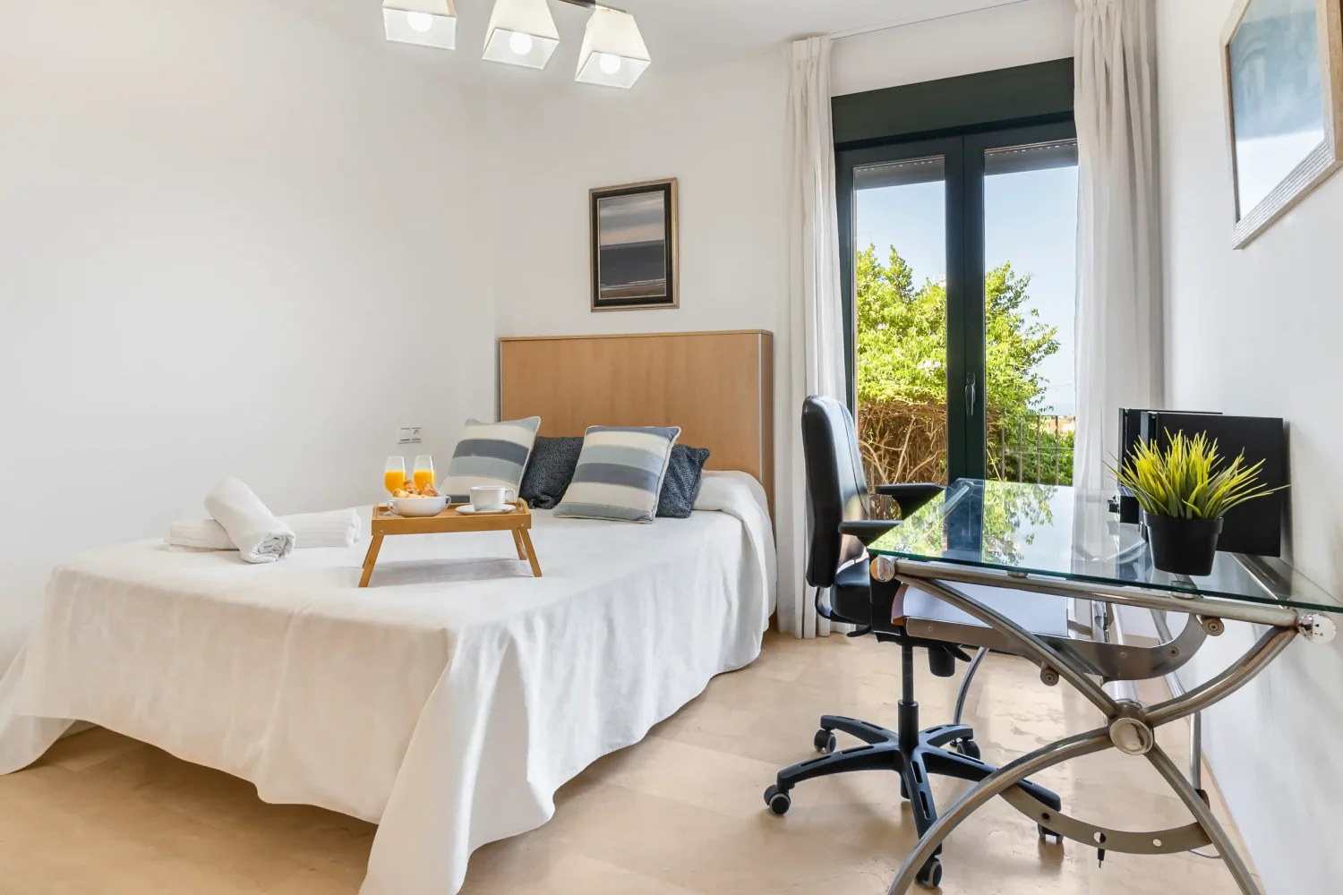 Bei Bedarf können zwei Monitore (einmalig 27 Zoll, Aufpreis einmal je 80 € pro Aufenthalt) inkl. Tastatur und Maus sowie drei Bürostühle (Aufpreis einmalig 35 € pro Aufenthalt) für die Kommodentische hingebucht werden.